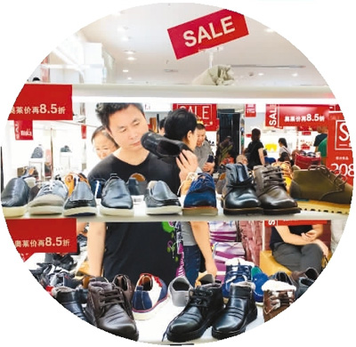 重庆某奥特莱斯店打折促销活动期间,一名消费者在选购皮鞋。