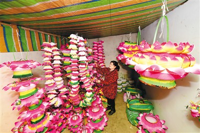河南省灵宝市焦村镇南安头村是远近闻名的“灯笼村”,村里100多户农民从事灯笼制作。临近元宵节,村民们加紧赶制多种造型花灯,供应节日市场。