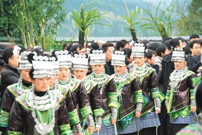 元宵佳节临近,贵州省从江县加勉乡党翁村苗族同胞身着民族盛装载歌载舞,表演山乡特色民俗节目。图为苗族同胞在吹芦笙。