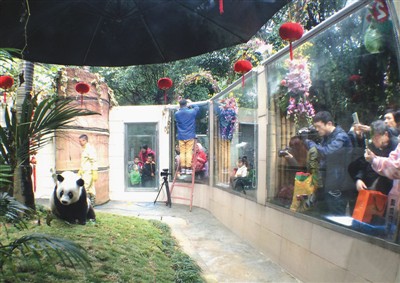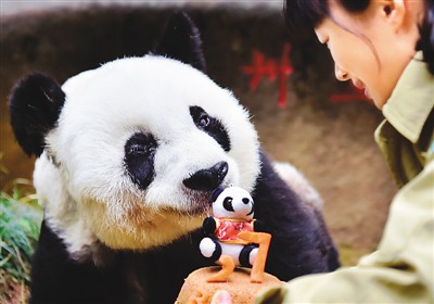 饲养员给“巴斯”送来特制的贺岁蛋糕。