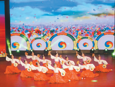 图为丹东市群众艺术馆群星艺术团演员表演朝鲜族舞蹈《边城鼓韵》。