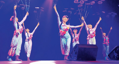 图为中国杂技团演员表演杂技《喧歌嬉调——转碟》