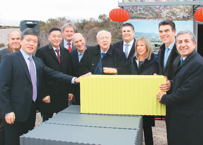 2月10日,由中国企业家投资建造的马赛国际商贸城正式开工。数月之后,一片由彩色集装箱搭建而成、洋溢着独特时尚气息的商贸园区将依山建起,与船只林立的马赛港相守相望。在马赛人眼中,这个投资额达3000万欧元、规模庞大的国际商贸城,将意味着新的就业、贸易和繁荣,奏响共建“一带一路”的马赛之歌。图为马赛市市长让-克洛·戈丹(右五)、中国驻马赛总领事朱立英(左前)等在马赛国际商贸城开工仪式上。