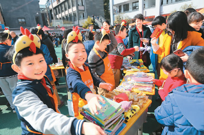 2月13日,开学第一天,浙江省温州市建设小学举行金鸡报“巷”传承温州风情暨新春义卖活动。学生们将家中菜地里种的蔬菜、生活闲置品、个人DIY制品等带到学校进行义卖,所得善款将全部捐给慈善机构。图为学生们在操场上义卖闲置品。