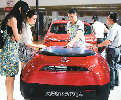 2016年5月20日,在第19届中国北京国际科技产业博览会的汽车科技展区,来自北汽集团的17款新能源汽车、智能汽车吸引了大量观展人员,无人驾驶、太阳能移动充电技术等备受关注。图为观众参观太阳能移动充电车。