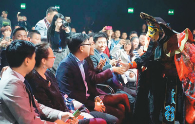 当地时间2月5日,“亲情中华”艺术团在葡萄牙里斯本演出,来自四川成都市非物质文化遗产保护中心的演员夏欢在表演川剧变脸时与观众互动。