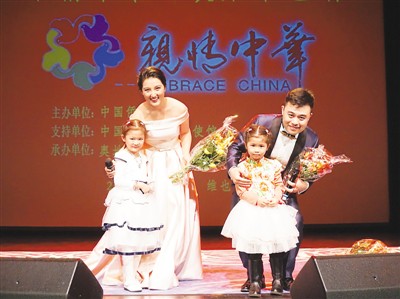 当地时间2月7日,“亲情中华”艺术团在奥地利维也纳演出,来自中国民族乐团的青年男高音歌唱家周炜(后右)与当地侨胞黄雪琳合唱歌曲《家和万事兴》后接受观众献花。