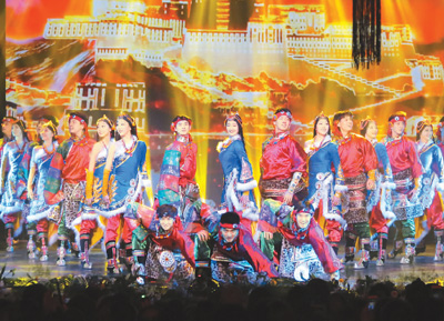 当地时间2月3日,“文化中国·四海同春”在匈牙利布达佩斯演出,来自中央军委政治工作部歌舞团的舞蹈演员在表演舞蹈《扎西德勒》。
