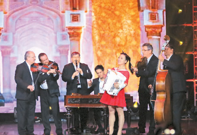 当地时间2月3日,“文化中国·四海同春”在匈牙利布达佩斯演出,青年手风琴演奏家阮明园与匈牙利艺术家一起表演节目《匈牙利舞曲第五号》。