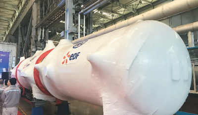 由中国东方电气(广州)重型机器有限公司(以下简称东方重机)自主研制的核电低压加热器14日在广州南沙整装发运,“远嫁”法国。这是中国首台出口欧洲的核电设备,创造了核电“走出去”的里程碑。图为核电低压加热器在广州南沙整装发运。