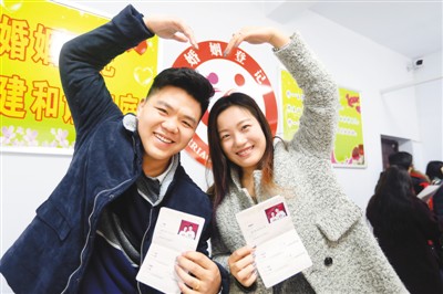 2月14日是西方情人节,众多新人选择在这一天办理结婚登记手续。