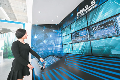 近日,河北省大厂回族自治县生态科技馆免费向公众开放,倡导大众关注生态问题、提升环保意识,爱护地球环境。据了解,该馆是一座集展览展示、知识普及、宣传教育为一体的多功能综合性展馆,展陈面积为2000平方米。图为游客在生态科技馆观看空气质量实时数据。