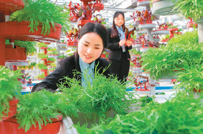近年来,江苏省淮安市盱眙县加快推进现代特色农业示范区建设,与知名农业院校共建现代农业产业科技创新中心和农业科技创新联盟,助推现代农业项目孵化与转化。盱眙县澳吉尔国际绿博园内引入的“气雾栽培”蔬菜工厂、瓜果无土栽培等一批科技创新项目相继投产,为早春的园区勾勒出一幅幅充满春意的画卷。图为工作人员对蔬菜进行管护。