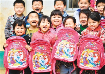 春节期间,广西大化瑶族自治县七百弄乡返乡创业青年蒙纪锋通过微信“朋友圈”,募集到300多个爱心书包。目前,蒙纪锋陆续将这批书包送到贫困山区孩子们的手中。图为2月15日,孩子们收到了新书包。
