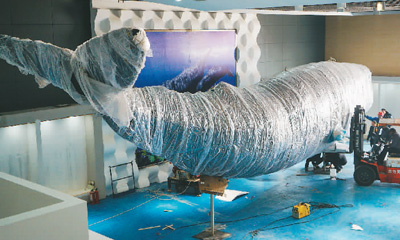 图为工作人员在组装抹香鲸标本。