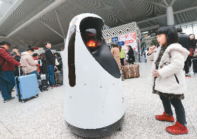 2月15日,郑州东站,“机器警长”同郑州东站民兵一起在站内巡逻。