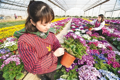 江苏省南通市海安开发区壮志村的“花中花园艺”生态园,依托高校智力支持,开展设施花卉的新品种、新技术、新模式的实验与推广,投资1.2亿元建成占地800多亩园艺生态园,引进国外的花坛花卉种子、花卉种球、园林绿化苗木等新品种进行大面积种植。图为2月18日,海安县城东镇花农在家门口“花卉工厂”里培育花卉苗木。