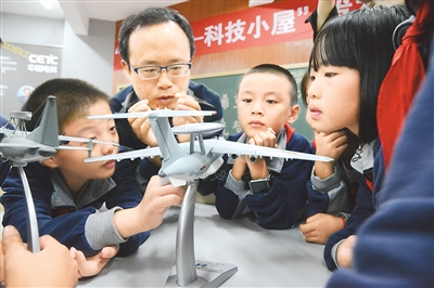 由中国电子科技集团公司参与的扶贫项目——帮助升级的四川省泸州市叙永县鱼凫小学科技小屋启用后很受学生喜爱。图为中国电科集团的志愿者在科技小屋内,和该校学生共同感受预警机、雷达、空间站等产品模型带来的科学魅力和乐趣。