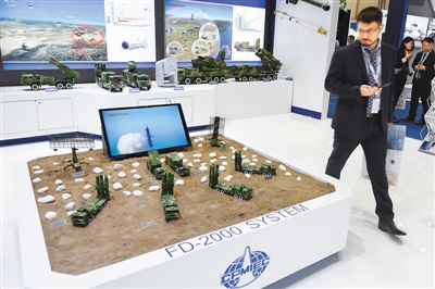 图为“中国防务”展区的FD-2000远程防空导弹武器系统模型。