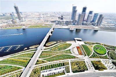 天津于家堡金融区的楼盘矗立在海河岸边。