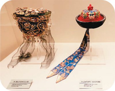 一月二十五日,沈阳故宫“锦绣宫闱”清宫后妃生活用品展在西配宫举行。图为清代后妃在宫廷宴席上戴的黑缎点翠串珠花女帽(左)。
