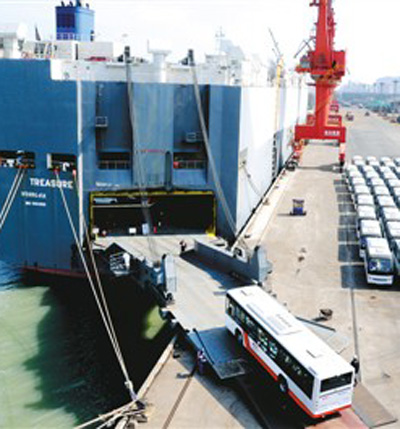 2月26日,在江苏省连云港港口码头,由河南汽车制造企业生产的292台宇通汽车,装船出口安哥拉,这是今年连云港港运往海外的最大一批国产汽车。作为中国沿海主要的汽车出口口岸之一,连云港港把汽车出口作为品牌货种开发,加大车辆出口承揽力度,着力提供优质装卸服务,汽车出口量逐年增长。
