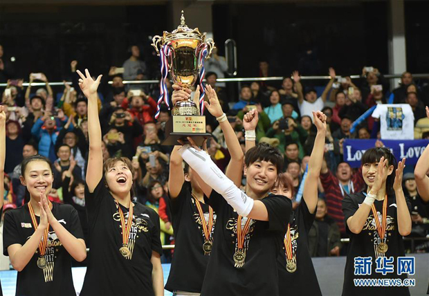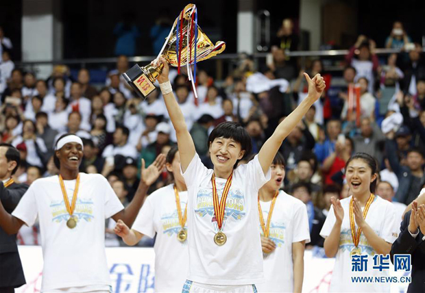 图为2016年3月8日,北京首钢队球员孙晓雨(前)在2015-2016赛季颁奖仪式上举起冠军奖杯。新华社记者王丽莉摄 图片来源:新华网
