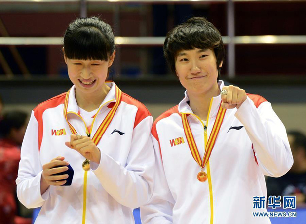 图为2012年10月27日,北京女篮球员张帆(右)与队友在2011-2012赛季总冠军颁奖仪式上展示总冠军戒指。新华社记者郭勇 摄 图片来源:新华网