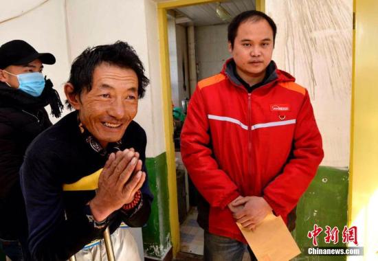 资料图:西藏的珠拉对新网购的洗衣机非常满意,双手合十感谢配送人员。李林 摄