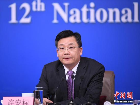 3月9日,十二届全国人大五次会议新闻中心举行记者会,邀请全国人大常委会法工委副主任张荣顺、副主任许安标,刑法室主任王爱立就“民法总则草案与人大立法工作”的相关问题回答中外记者的提问。图为许安标回答记者提问。中新社记者 侯宇 摄