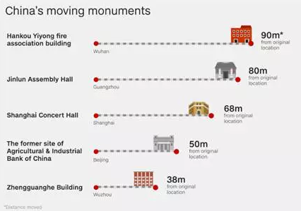 报道称,1995年-2015年,中国城市人口急剧上升,伴随着城市化浪潮,中国大兴土木,仅在2016年就建起了84座摩天大楼。在城市里扩建过程中,迁移历史建筑成为了保护其的较好选择:花费少、省时、又环保。