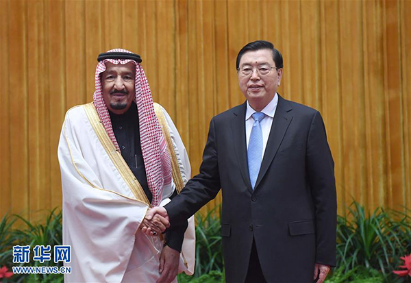 3月17日,全国人大常委会委员长张德江在北京人民大会堂会见沙特国王萨勒曼。