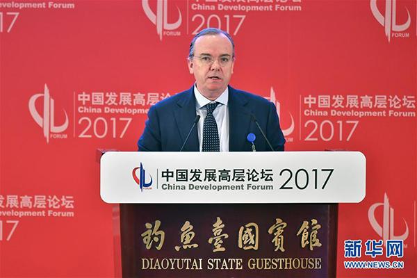 3月19日,汇丰控股有限公司集团行政总裁欧智华在开幕式上致辞。当日,中国发展高层论坛2017年年会在北京开幕。本届中国发展高层论坛由国务院发展研究中心主办,主题是“中国与世界:经济转型和结构改革”。来自国内外的专家学者、企业家、政府官员和国际机构代表参加开幕式。
