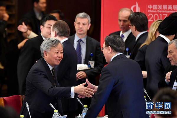3月19日,亚洲基础设施投资银行行长金立群(前左)在开幕式前与嘉宾交流。当日,中国发展高层论坛2017年年会在北京开幕。本届中国发展高层论坛由国务院发展研究中心主办,主题是“中国与世界:经济转型和结构改革”。来自国内外的专家学者、企业家、政府官员和国际机构代表参加开幕式。