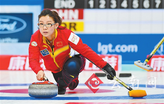 中国队选手王冰玉在比赛中掷壶。新华社发