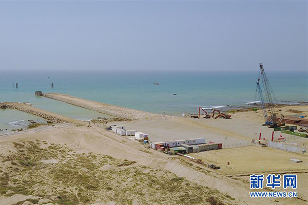 这是3月21日在巴基斯坦俾路支省胡布地区用无人机拍摄的正在建设中的胡布燃煤电厂配套码头设施。