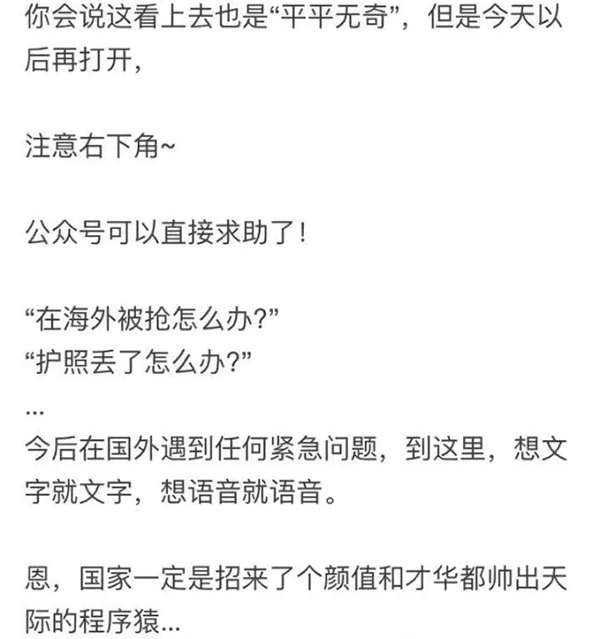 从今天开始,你走到哪里,“祖国爸爸”就能保护你到哪里!只需要一部手机,就能在微信里找外交部“帮忙”!有木有很霸气?