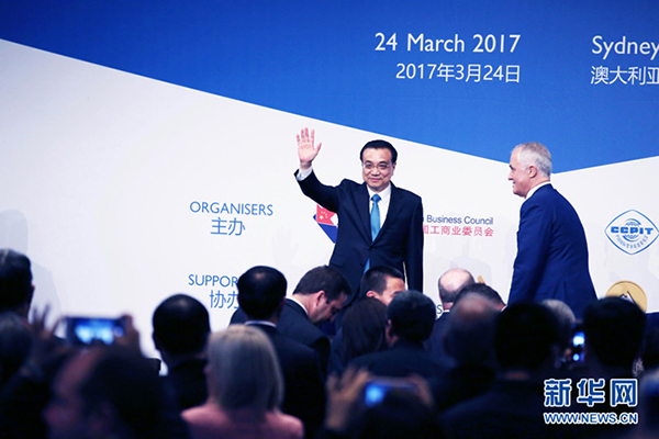 当地时间3月24日,中国国务院总理李克强在悉尼与澳大利亚总理特恩布尔共同出席中澳经贸合作论坛并发表演讲。(图片来源:新华社 姚大伟摄)