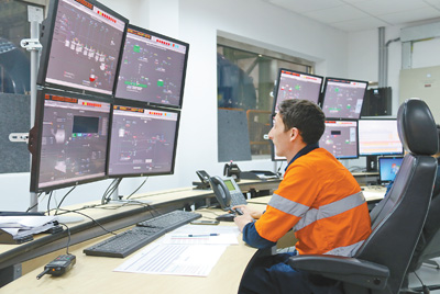 哈方员工在中央控制室通过电脑监控工厂设备运行。