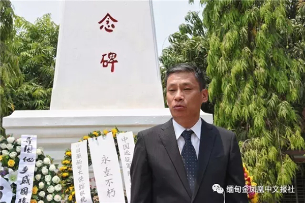 中国驻缅甸大使馆代办陈辰代表使馆整理花圈挽联并致辞,七十五年前,四十万中国远征军为了守护世界和平、捍卫祖国的尊严,不惧辛苦、不畏牺牲,远赴缅甸挽救人民于危难,谱写了壮丽的爱国诗篇,为世界反法西斯战争的胜利做出了卓越贡献。