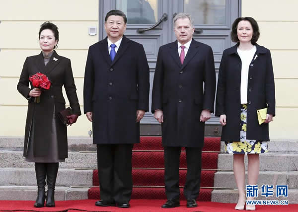 4月5日,国家主席习近平在赫尔辛基同芬兰总统尼尼斯托举行会谈。会谈前,习近平出席尼尼斯托在总统府庭院举行的隆重欢迎仪式。这是习近平和夫人彭丽媛同尼尼斯托和夫人豪吉欧在欢迎仪式上。新华社记者 兰红光 摄