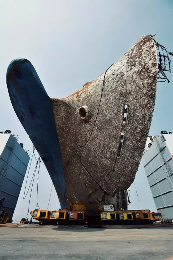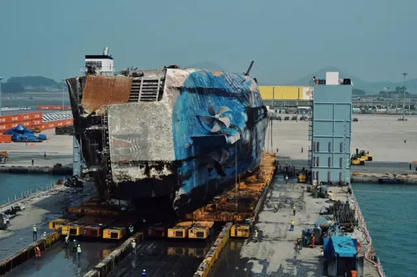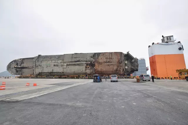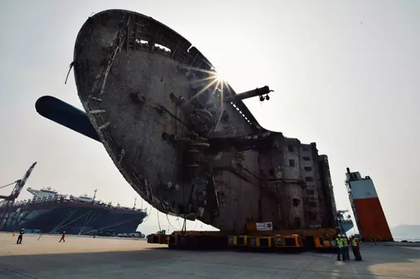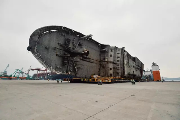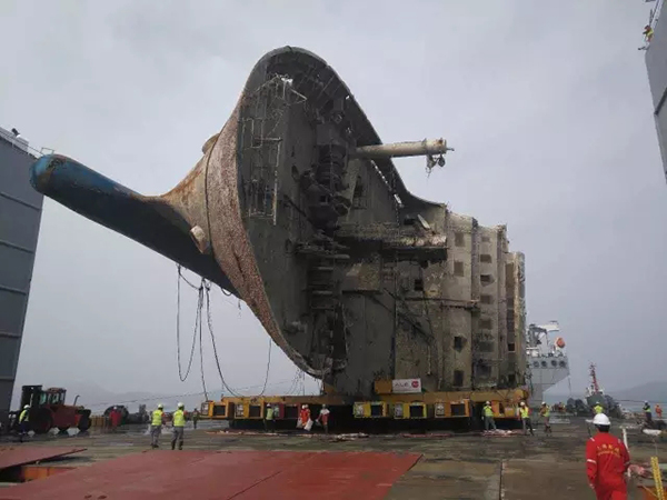 韩国当地时间4月9日下午17时35分,“世越号”整体起浮后的第15天,在8列自行式模块载重车的抬行下,“世越号”船体被缓缓从半潜船上滚卸至木浦新港码头。这也标志着上海打捞局执行的韩国“世越号”打捞工程顺利竣工。