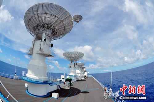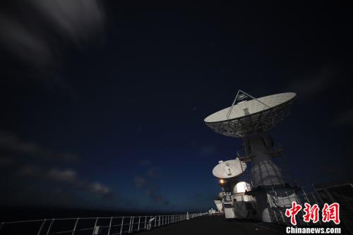 “远望6号”远洋航天测量船4月13日电(高超、倪栋梁)12日夜,赤道附近预定海域,浪高1米,风速每秒3米。宁静的夜空星光璀璨,海浪轻轻拍打船舷,整齐列阵的天线被底座的灯光照亮,映出清晰的轮廓。