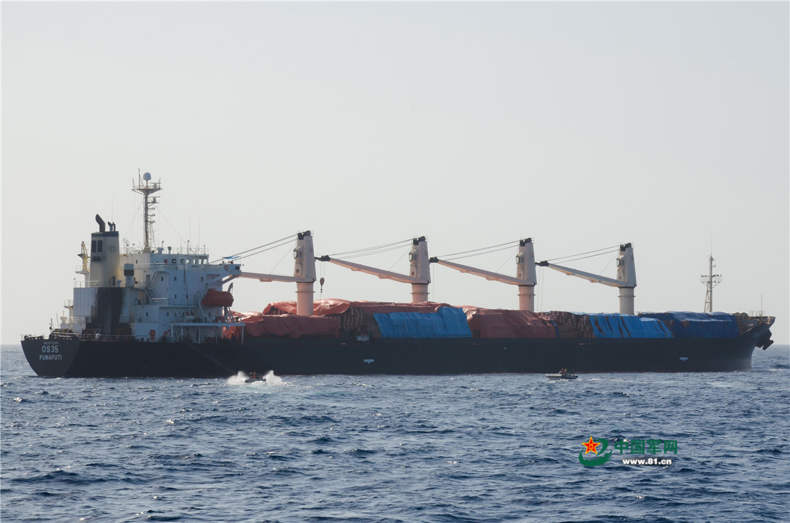 货船在玉林舰的警戒下驶向也门亚丁港引航锚地。李维 摄
