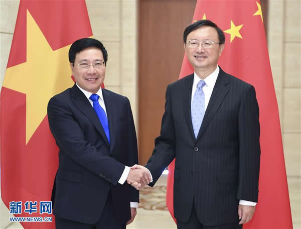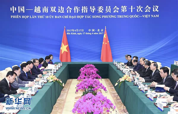 4月17日,中国-越南双边合作指导委员会第十次会议在北京举行。中国国务委员杨洁篪和越南副总理兼外长范平明共同主持。新华社记者张领摄