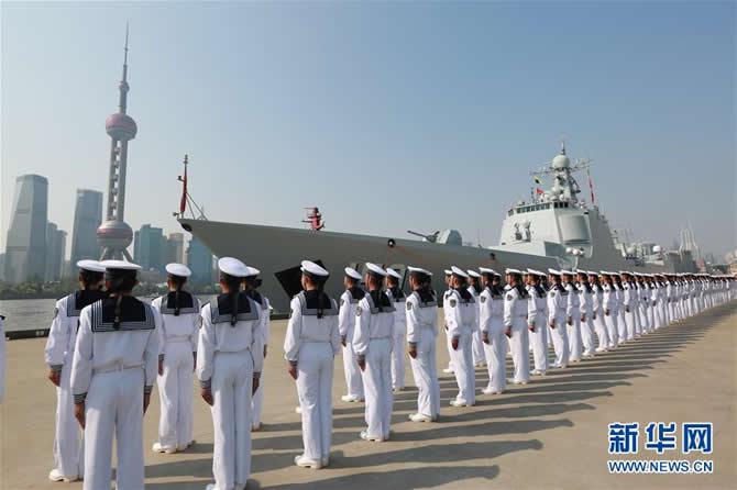 4月23日,欢送仪式上,部队官兵在上海黄浦江畔为远航访问编队送行。当日,人民海军成立68周年之际,由导弹驱逐舰长春舰、导弹护卫舰荆州舰和综合补给舰巢湖舰组成的远航访问编队,上午从上海黄浦江畔启航,将赴亚洲、欧洲、非洲和大洋洲的20余个国家进行为期近180天的友好访问。这次任务是人民海军历史上访问国家最多、出访时间最长的一次远航访问。新华社发(禹威 摄)