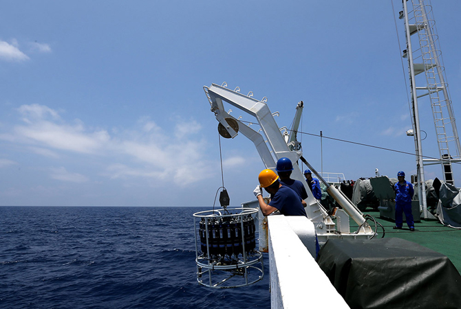 4月25日,科考队员用温盐深仪(CTD)进行海水温度、盐度等调查。
