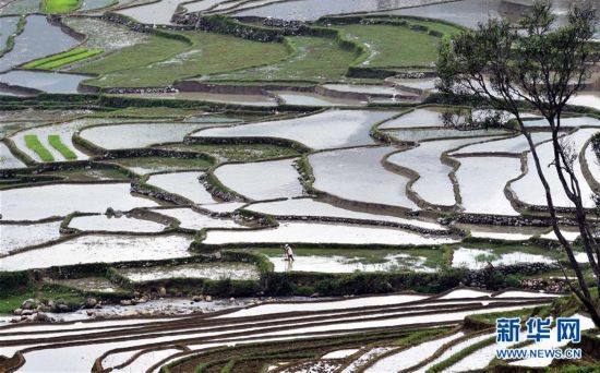 近日,云南省金平苗族瑶族傣族自治县的十余万亩高原梯田水暖秧苗绿,农民们纷纷下地劳作,护秧耙田准备栽插水稻。