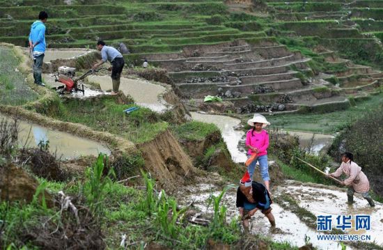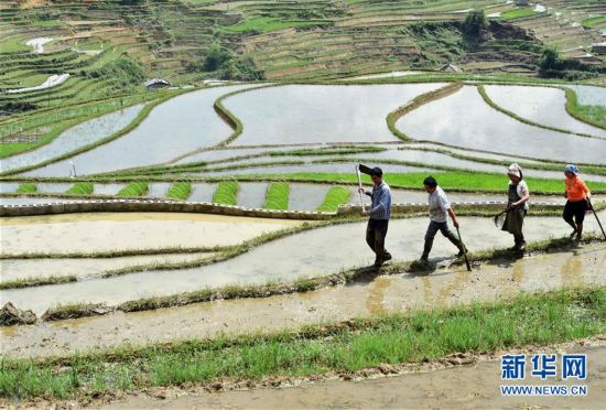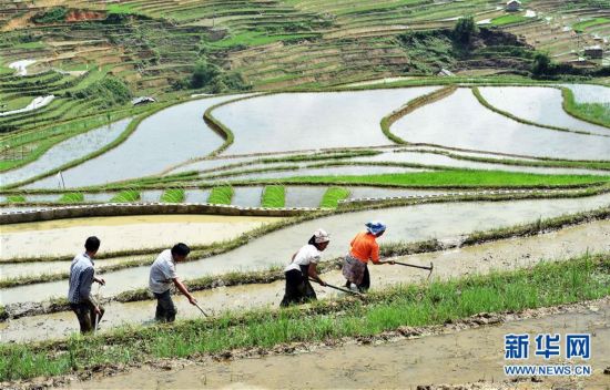 4月26日,金河镇水碓冲村的几位村民在田间劳作。新华社记者 陈海宁 摄