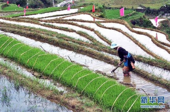 4月26日,金河镇干塘村村民在秧田里护理水稻秧苗。新华社记者 陈海宁 摄